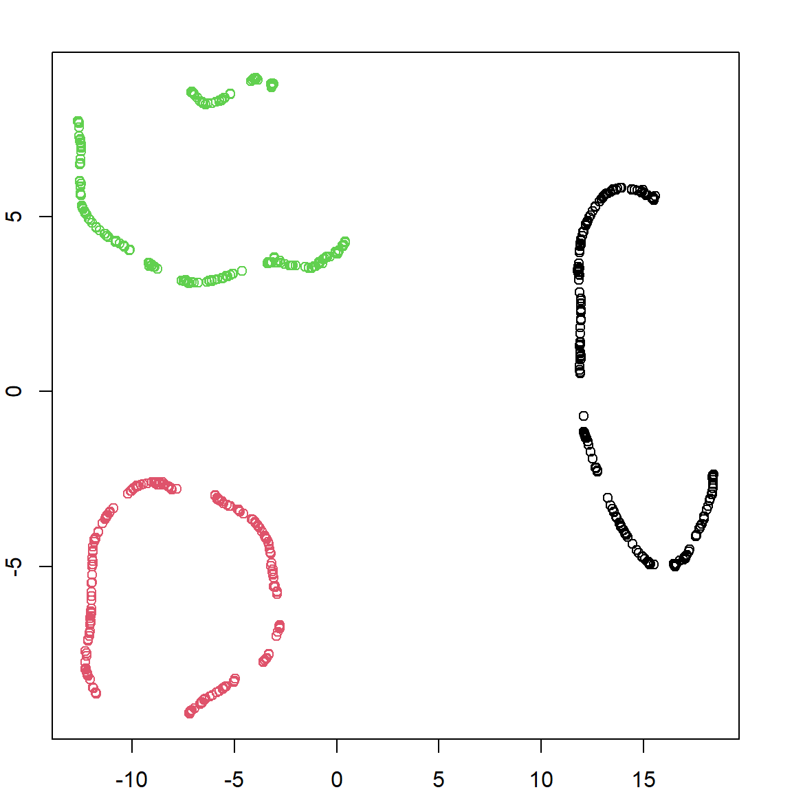 There are two methods that are worth to mention here, t-SNE (Van der Maaten and Hinton 2008) and spectral embedding (the embedding step in spectral clustering). All of these methods are graph-based, meaning that they are trying to learn an embedding space such that the pair-wise geometric distances among subjects in this embedding space is “similar” to the graph defined in the original data. Here, an example of the graph is the k-nearest neighbor graph (for spectral clustering), which counts 1 if two subjects are within each others neighbors. But for t-SNE, the graph values are proportional to the kernel density function between two points with a t-distribution density function.