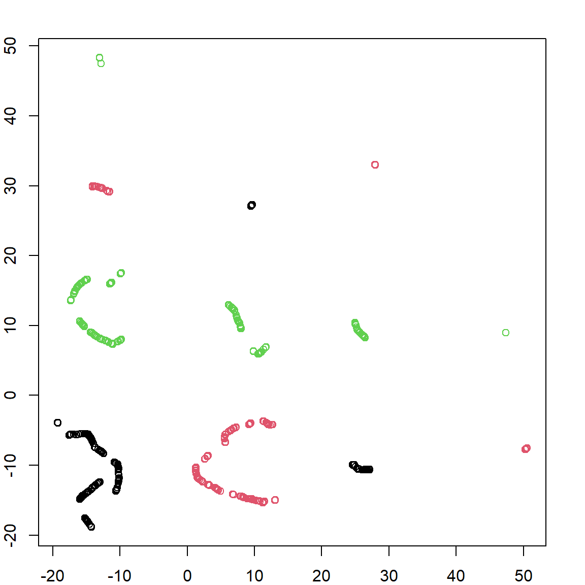 You can see that the result is not as perfect as we wanted. It seems that there are more groups, although each group only involves one type of data. There are other parameter you may consider tuning. For example