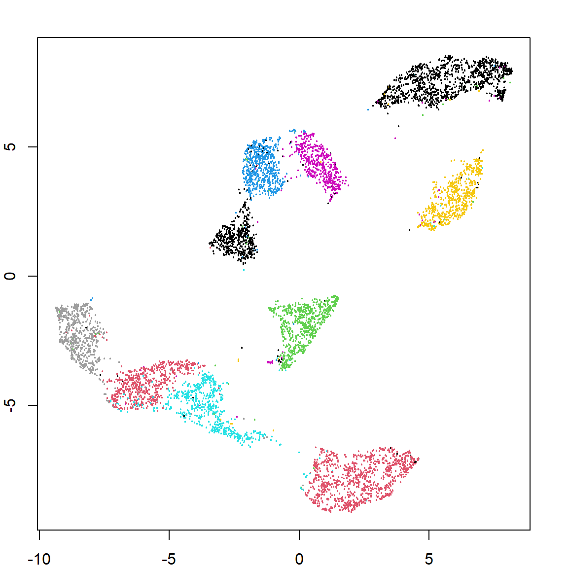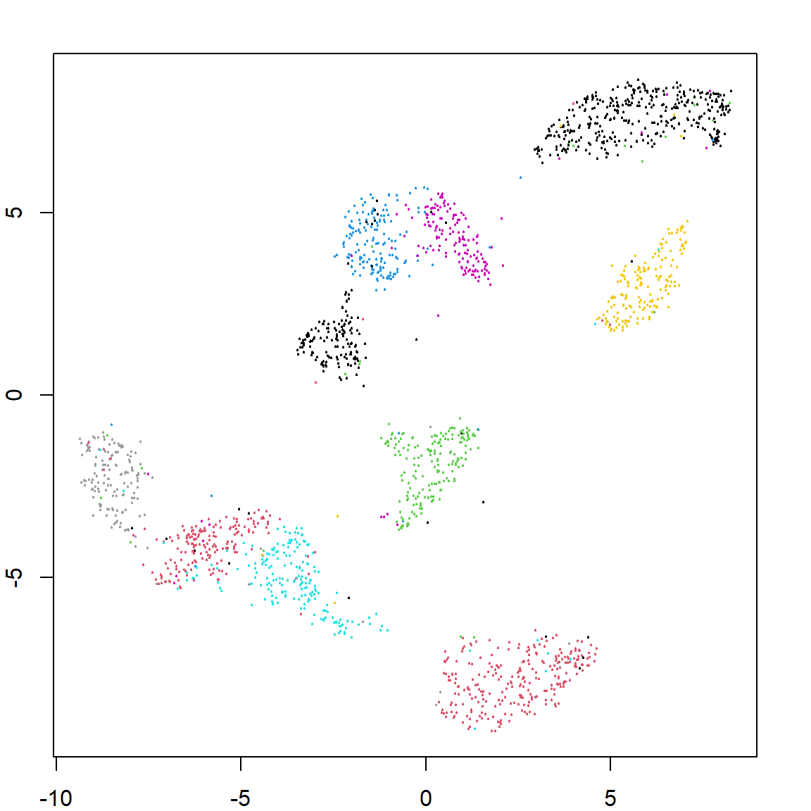 plot(zip.umap$layout, col = zip.train[, 1]+1, pch = 19, cex = 0.2)